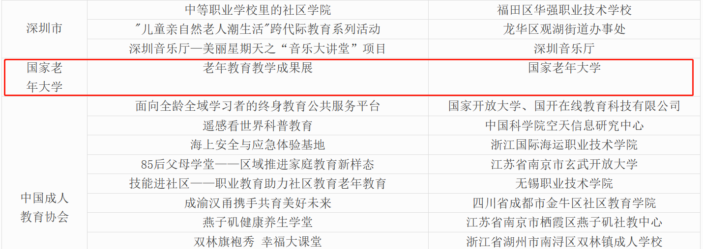近日,中国成人教育协会发布了《关于2023年全国新时代“百姓学习之星”“终身学习品牌项目”名单公示的通知》,由国家老年大学推介的“老年教育教学成果展”成功入选2023年中国成人教育协会发布的“终身学习品牌项目”推介名单。