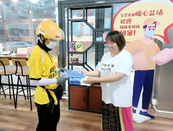 林则银(右)在社区暖心益站给快递小哥送雨衣