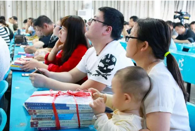 课堂上,有2位特殊的“学生”吸引了不少人的目光:一个愣头愣脑的小男孩,一位斯斯文文的小姑娘,他俩陪着各自的母亲,也坐在座位上,小男孩充满好奇地抓着妈妈新领的书,小姑娘有模有样地拿着铅笔在本子上写写画画。“提孩巧相如”的年纪,在380多人的大教室里,居然不吵也不闹,十分乖巧。