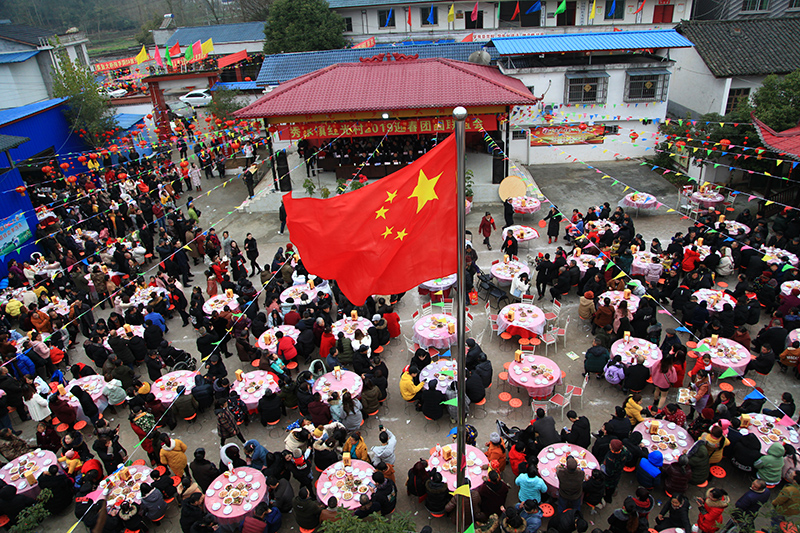 村里举办千人坝坝宴共迎新春。改革开放和十九大提出的乡村振兴战略,使农村发生了翻天覆地的变化,农村正在从过去贫穷落后物质匮乏的年代逐步走向小康富裕,成为安居乐业的美丽家园。