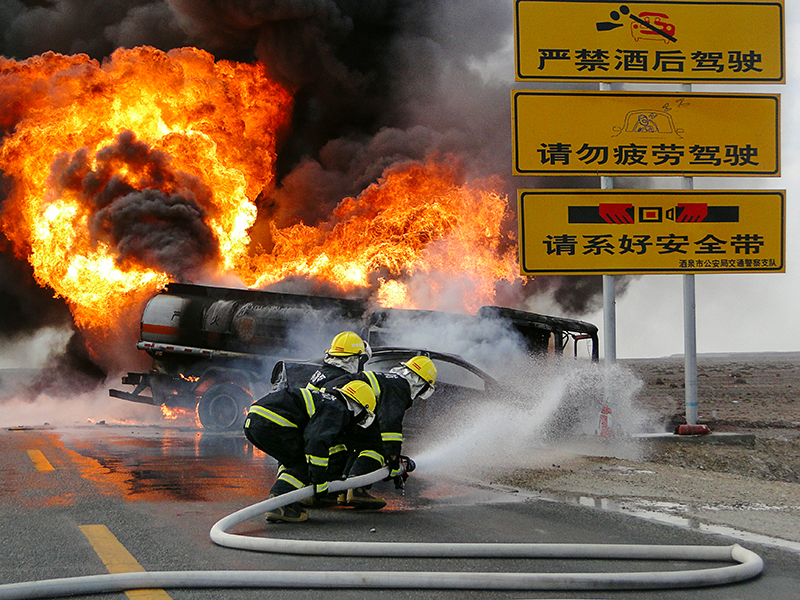 2018年12月9日,一辆满载液化气的槽车在连霍高速发生交通事故引发火灾,嘉峪关市、酒泉市消防支队接警后合力处置,赶到后火势燃烧猛烈,随时有爆炸危险,南边一村庄受到威胁,危急时刻,消防员冒死灭火、管阀、堵漏,最终化险为夷。