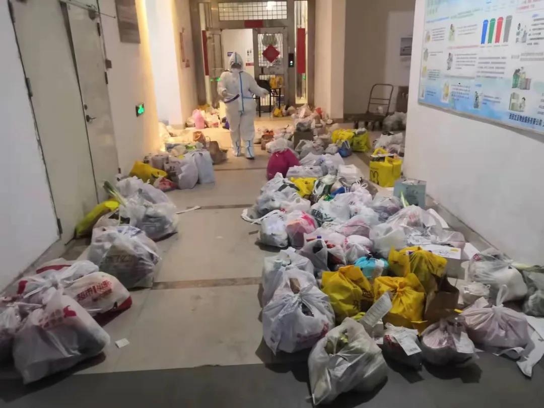 隔离刚开始的时候整个小区的个别群众陷入了恐慌中,跑下楼要强行闯出,少数群众出现焦虑在楼道走来走去,志愿者见状一一劝他们回家。姜聪住的这个小区有两栋楼,约3000住户,每天都有大量生活物资堆在小区的门口等待进行消杀后分拣送达。姜聪积极协助医护人员一户一户的做核酸,做完核酸后一遍一遍的对每一层楼进行消杀,同时还要马不停蹄的分拣配送物资。在电话交流中,姜聪谈到自己的体验,“第一次感受到防护服是真的热,感受到医护人员的辛苦,戴着口罩和防护面罩稍微跑动一下就闷的喘不上气,汗水顺着头发丝流进脖子里,脱下防护服是真的酸爽,夹杂着浓郁的汗臭味,防护面具下的头发紧紧贴在头皮上,脸上全是勒痕。全天不敢喝水不敢多吃就怕去厕所,一套防护服是80元,真的不能浪费。第一天下来,深感医护人员的辛苦,对医护人员更多了一份钦佩和尊重。”