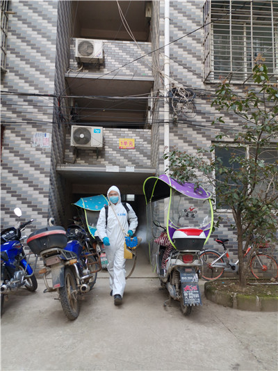 自3月5日到鄂州集结以来,王贵每天和队员们一起,对市区居民楼、厂区、汽车站、火车站、学校等场所进行消杀工作,协助转运医疗废弃物品,帮助居民搬运生活物资,在超市执勤查验居民体温和健康码,并检查火灾隐患、张贴消防提示。作为援鄂力量突击大队七分队五班二组的组长,王贵发扬不怕苦,不怕累的精神,面对有确诊病例的小区,能克服恐惧心理,冲在最前面,经常能听到他说,“这一栋我来”。王贵负责的区域大多是老旧小区,层高七层至十层不等,且都没有电梯。他每天穿着防护服戴着护目镜背负六十多斤的消防液桶和弥雾机进行作业,脚上磨的全是血泡,肩膀上也出现红肿,衣服湿了又干、干了又湿,当他脱下防护服的那一刻,总能看到防护服上,那一圈圈像盐似的白色印迹。有时需要去偏远城郊进行消杀,王贵和队员们更要起早贪黑,为了能让自己的兄弟们多休息会,王贵经常一个人连续作战,消杀完一个单元,紧接着又消杀下一个单元,毫无怨言。他笑着说:“晚上脱袜子时,袜子和肉黏着拉都拉不开。”