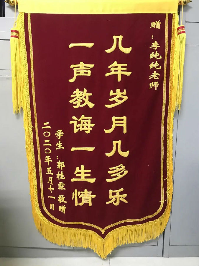 “打开快递看到郭同学送给我的锦旗,我第一反应是非常惊讶,锦旗上的两句话,让我十分感动,小小锦旗是对我班主任工作的肯定,同时也觉得惭愧,我能为学生做的还可以更多,更好......”