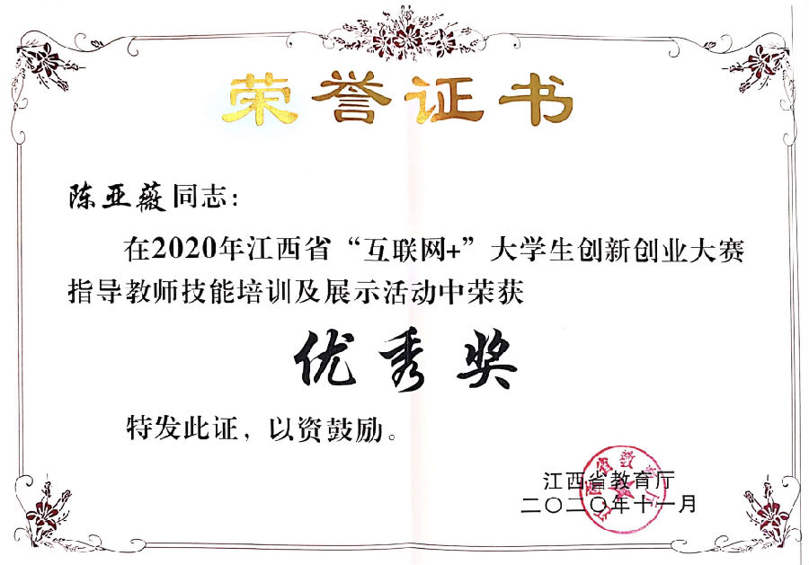 陈亚薇始终坚定教师是立校、强校之本,师德是教育之魂。从踏入江西开放大学的那一刻起,她便忠诚于党的教育事业,认真执行党的教育路线、方针,严格按照党的教育政策、根据教学大纲认真教学,为人师表,全心全意做好教书育人工作,以高度的责任感和事业心投入到教育工作中去。