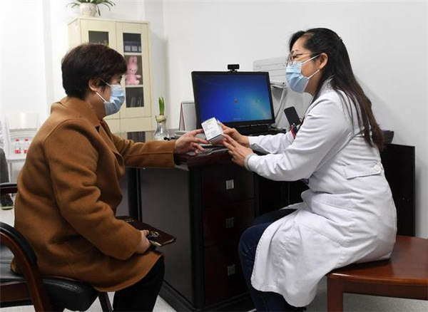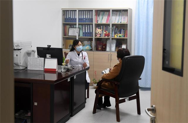 在广西壮族自治区妇幼保健院,杜丽群(左)向阮毅燕医生了解罕见疾病用药及其价格情况(2月16日摄)。