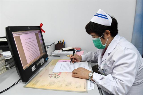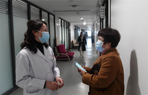 在广西南宁市第四人民医院,杜丽群(左)和护士交流病人用药情况(2月16日摄)。