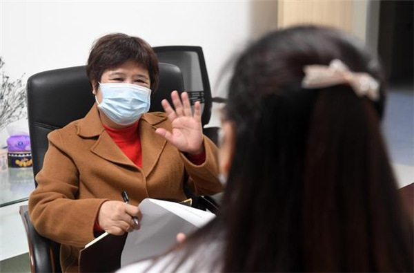 在广西壮族自治区妇幼保健院,杜丽群(左)与护士交流(2月16日摄)。