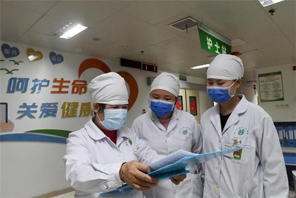 在广西南宁市第四人民医院,杜丽群(右二)和护士交流病人用药情况(2月16日摄)。