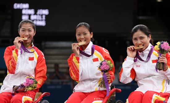 2012年伦敦残奥会,荣静(左)、伍百丽(中)、姚芳(右),在伦敦残奥会轮椅击剑女子团体重剑决赛中夺得冠军