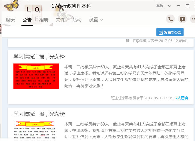 2017春行政本科班一共69名学生,是李凤梅带的第三个行政管理专业的本科班,因为对专业规则的熟悉,李凤梅在导学时更加规范高效。规范工作的第一步是建立实名制QQ群并制定群管理制度。全班69人,一对夫妻和一对姐妹中只保留一人进入QQ群,其他所有同学全部进入群,并在入学初期公布群管理制度。《球王会官网学习指南》是新生的公共课,李凤梅设置课程的初衷是让学生们通过课程对球王会官网有总体了解,学生们通过登陆网站来学习并考试通过这门课程。通过该课程的启迪,李凤梅做了一份电子版《新生学习指南》,用热情的语言和详细的分析,为新生介绍本学期课程安排、考试形式、完成的时间节点以及学习过程中的注意事项,公开自己的联系方式和工作时间,并提醒学生们注意聊天不要影响工作和家庭,好好休息注意身体健康。该文件放入群文件后成为新生必读文件,通过校讯通消息和群公告来提醒每个学生下载学习。