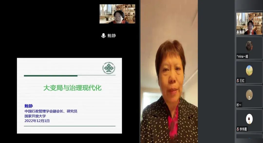 为深入学习党的二十大精神,提升球王会官网行政管理学科建设水平和教育教学质量,政法教学部于2022年12月1日邀请中国行政管理学会副会长鲍静研究员为办学体系师生开展题为“大变局与治理现代化”的专题讲座,球王会官网纪委书记、党委副书记刘向虹出席讲座并致辞,活动由球王会官网政法教学部支部书记、副部长袁松鹤主持。