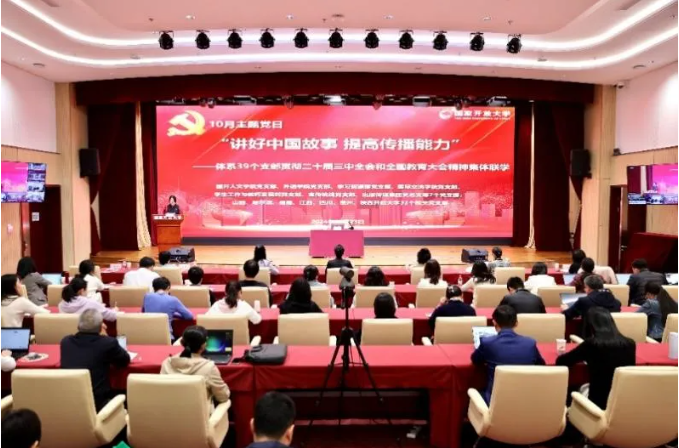 10月23日,为深入学习贯彻党的二十届三中全会精神和习近平总书记在全国教育大会上的重要讲话精神,准确把握建设教育强国应如何讲好中国故事,提高开放教育的国际传播力和影响力,发挥开放大学体系联动优势,助力国家构建更有效力的国际传播体系,球王会官网总部7个党支部将党建与业务紧密结合,与体系7家开放大学的32个党支部联合开展“讲好中国故事 提高传播能力”主题党日活动。活动以线上、线下相结合的方式进行,除北京主会场外,同步在太原、哈尔滨、福州、南昌、成都、贵阳和西安设立7个分会场。活动由人文学院党支部书记韩仪主持。
