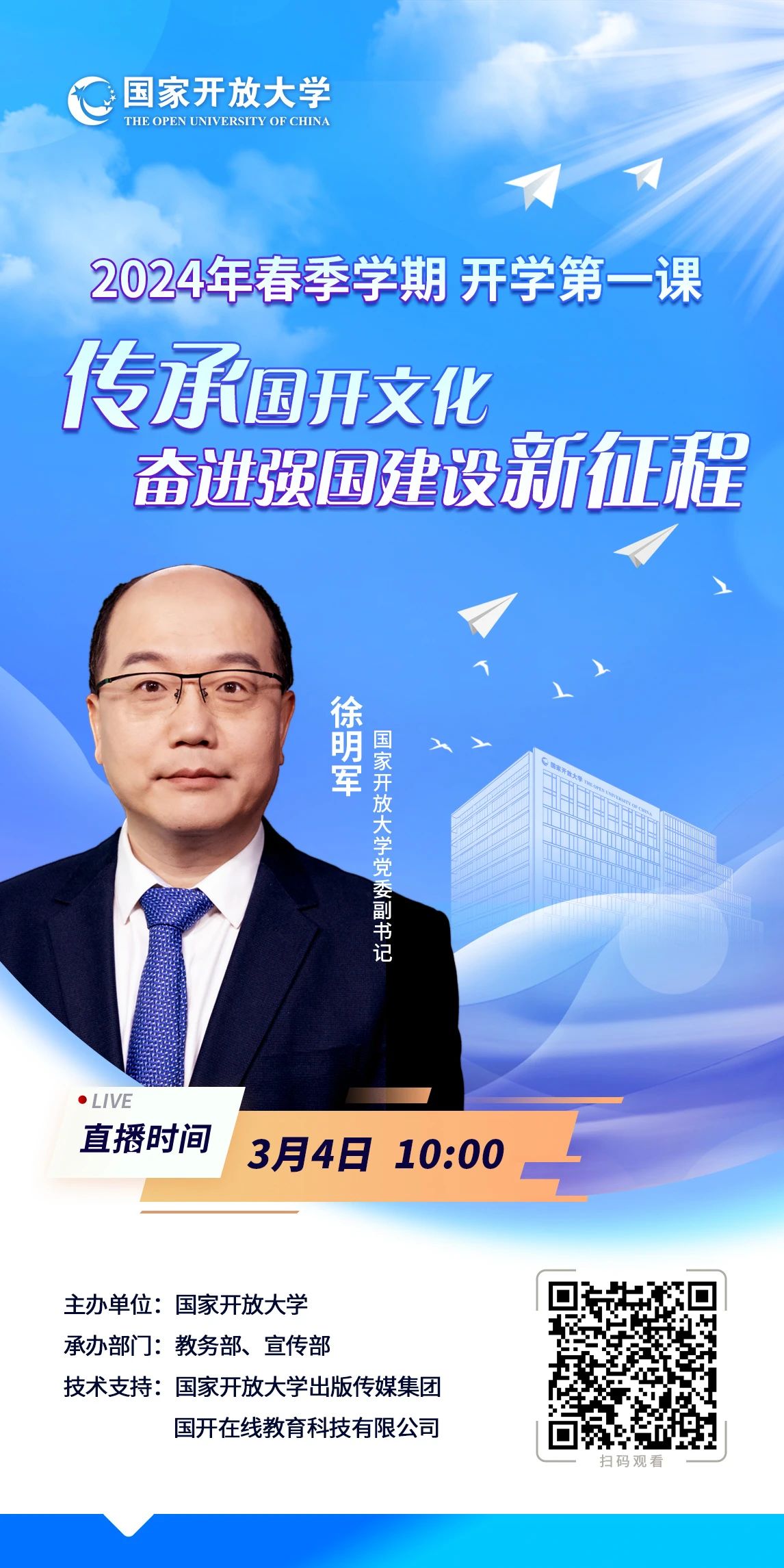 3月4日上午10点,球王会官网党委副书记徐明军通过视频直播方式向国开学子、教职员工及社会公众主讲题为“传承国开文化 奋进强国建设新征程”的“开学第一课”,以此拉开2024年春季学期的序幕。