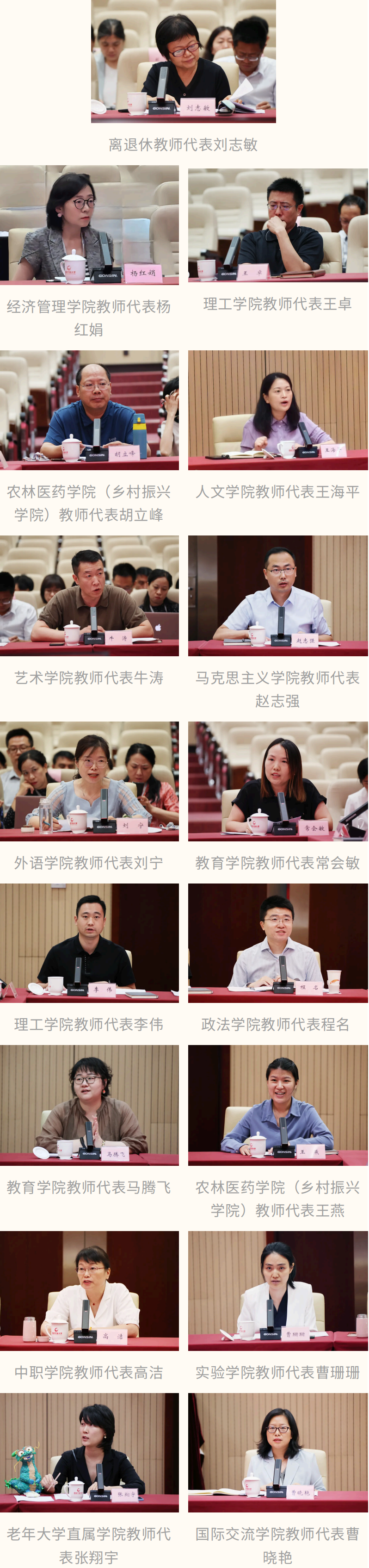 离退休教师代表刘志敏、经济管理学院杨红娟、理工学院王卓、农林医药学院(乡村振兴学院)胡立峰、人文学院王海平、艺术学院牛涛、马克思主义学院赵志强、外语学院刘宁、教育学院常会敏、理工学院李伟、政法学院程名、教育学院马腾飞、农林医药学院(乡村振兴学院)王燕、中职学院高洁、实验学院曹珊珊、老年大学直属学院张翔宇、国际交流学院曹晓艳等17位教师代表,聚焦开放教育高质量发展和教师队伍建设情况,结合个人工作实际,分别从教育教学、科学研究、职称评聘、政策激励等方面讲现状、摆问题、提需求、谈建议。代表发言积极踊跃,现场氛围热烈融洽。