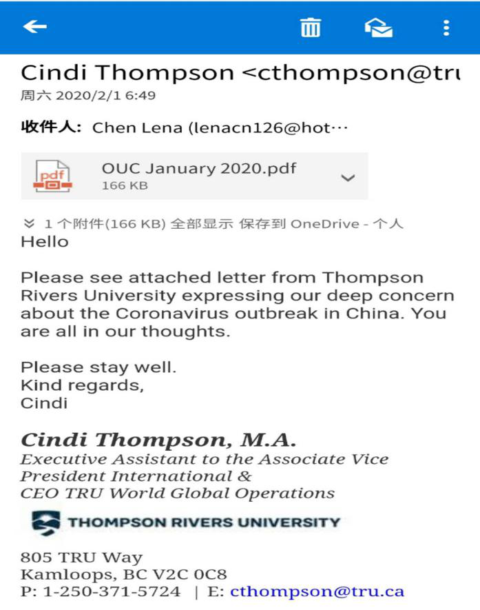 加拿大汤姆逊大学发来邮件,对国开全体领导与师生表达关心