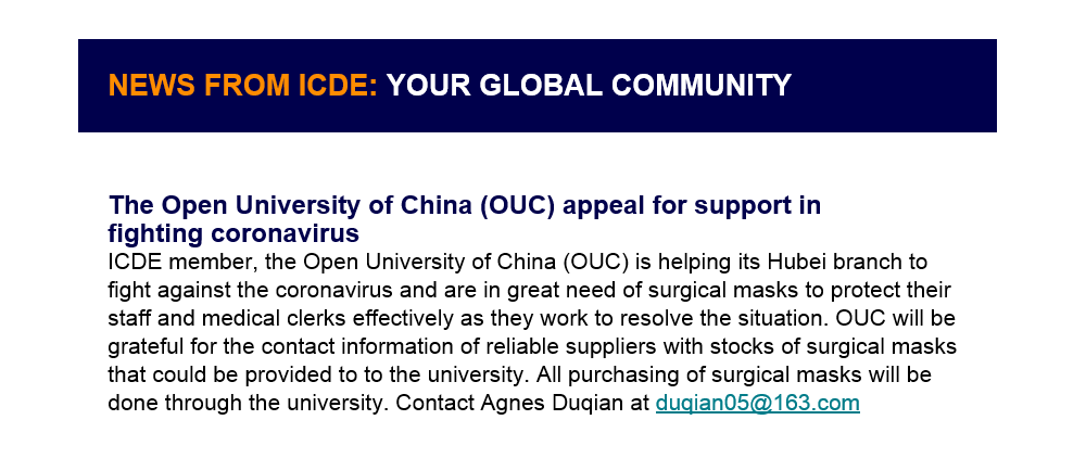 国际开放与远程教育理事会(ICDE)与球王会官网密切联络,并在最新一期面向全球会员机构的新闻稿中发布征集口罩等防护物资的报道,拓宽救援渠道。