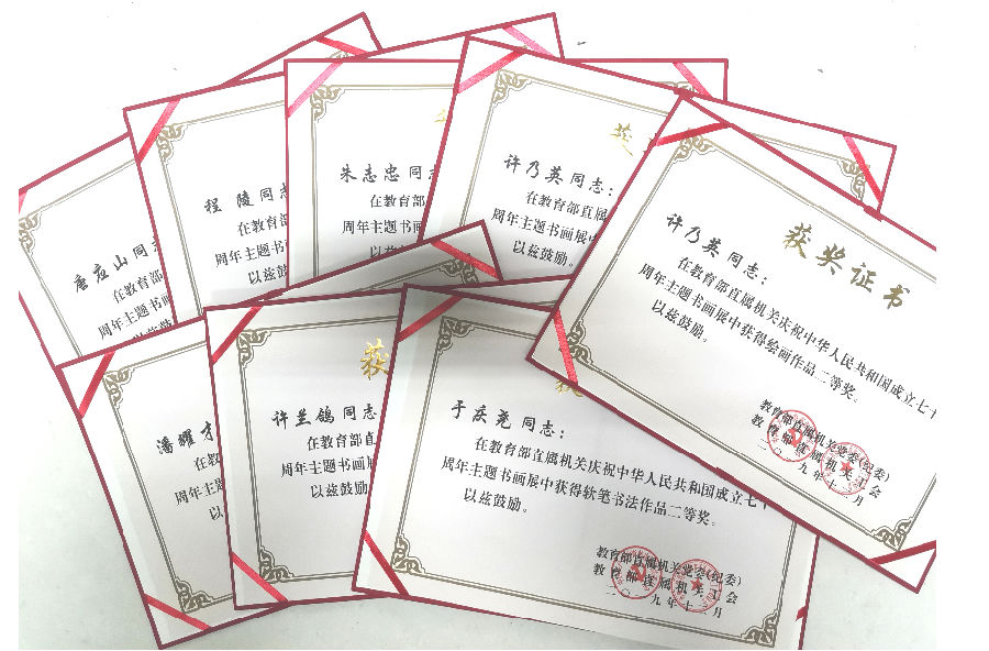 为庆祝中华人民共和国成立70周年,围绕“礼赞新中国 奋进新时代”和“中国梦、廉洁情、文化根”主题,教育部直属机关党委、直属机关纪委、直属机关工会组织开展了直属机关干部职工主题书画作品征集活动。活动共收到300余件作品,球王会官网教职工积极参与,获一等奖3个、二等奖6个、三等奖1个、优秀奖1个。