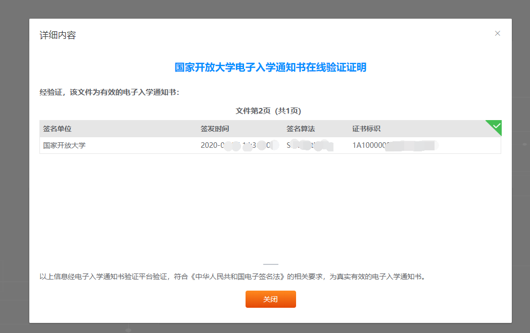 可信电子证照是具有电子签章的PDF版电子文件。2019年4月《国务院关于在线政务服务的若干规定》进一步明确电子签名、电子印章、电子证照等所具有的法律效力。此次签发的电子入学通知书是学校启动的第一类电子证照业务,采用了国密算法和国际加密算法相结合的双重数字签名,不仅有力保证了文件的可信度和不可篡改性,而且使得文件具有更强的安全性和自主性。学生可通过Adobe阅读器打开电子入学通知书,点击“球王会官网”印章,获得文件签名验证状态,查询数字证书的签名属性、签发时间等信息。学生也可访问“球王会官网阳光招生服务平台”(http://sun.zs.ouchn.edu.cn/),在线验证证书真伪。