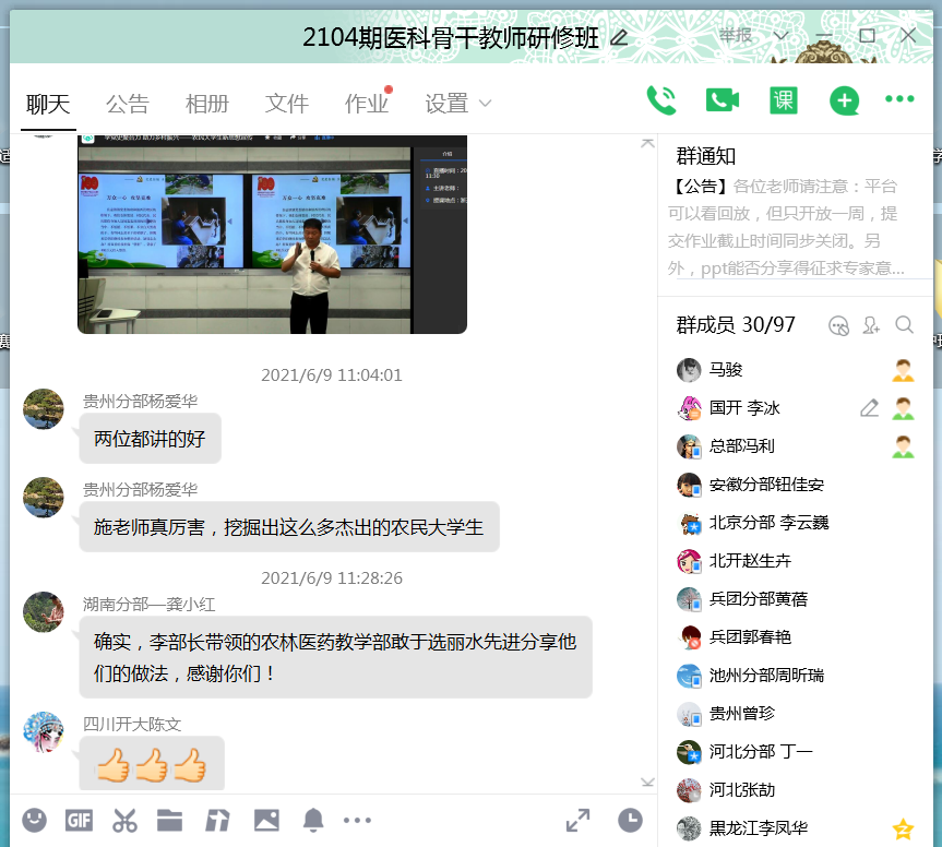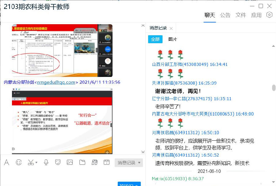 老师们表示,此次研修,正值党史学习教育深入开展之际,内容丰富,形式多样,不仅有专业知识的分享,还有党史学习教育专题,也有课程思政的探索实践,通过研修学习,推进了党史学习教育,拓宽了专业课程思政的思路,深化了继续教育、在线教育、乡村振兴、健康中国等领域的认知和理念,丰富和拓展了农、医科类专业发展及人才培养相关的前沿知识,提升了专业素养和教学能力。大家一致表示,将努力把本次研修学习到的知识运用到教学实践中去,立德树人,不负韶华。