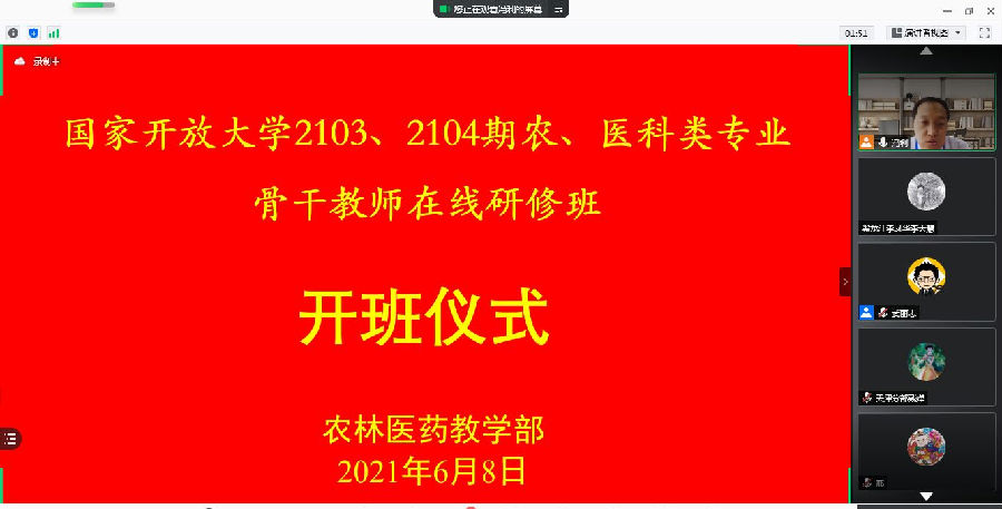 为进一步落实立德树人根本任务,全面加强球王会官网办学组织体系农、医科类教师队伍建设,提升教师思想政治素质和育德育人能力,提高教师在线教育理论素养和专业教学能力,2021年6月8日至11日,球王会官网举办了第2103、2104期农科类(含“一村一名大学生计划”)、医科类专业骨干教师研修班。根据疫情防控要求,此次研修班采取线上培训方式,通过球王会官网新平台(lms.ouchn.cn)进行,来自总部、33个分部及生命健康学院的近200名教师参加。