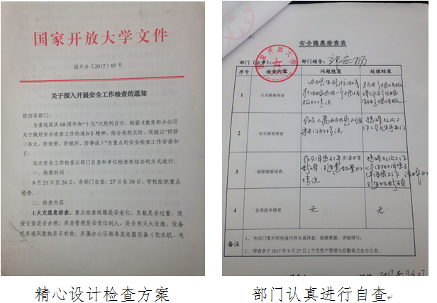 一是组织了全校性的安全自查活动,期间共排查各类问题隐患4大类168个,清理报废各类物资300余件,清除各类杂品垃圾5车约12吨,安全自查工作受到了教育部办公厅的通报表扬。
