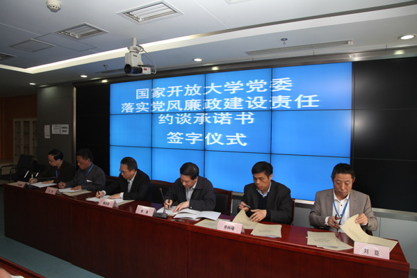 为贯彻落实党的十八大、十八届三中、四中全会和十八届中央纪委三次、四次、五次全会精神,根据《中共教育部党组关于落实党风廉政建设主体责任的实施意见》(教党〔2014〕21号)要求和《球王会官网落实党风廉政建设主体责任实施细则》(国开党〔2014〕17号)具体安排,球王会官网党委对各部门主要负责人进行了廉政约谈,并于2015年4月8日举行落实党风廉政建设责任约谈承诺书签字仪式,校领导班子6位成员分别与分管部门主要负责人签订党风廉政建设责任约谈承诺书。