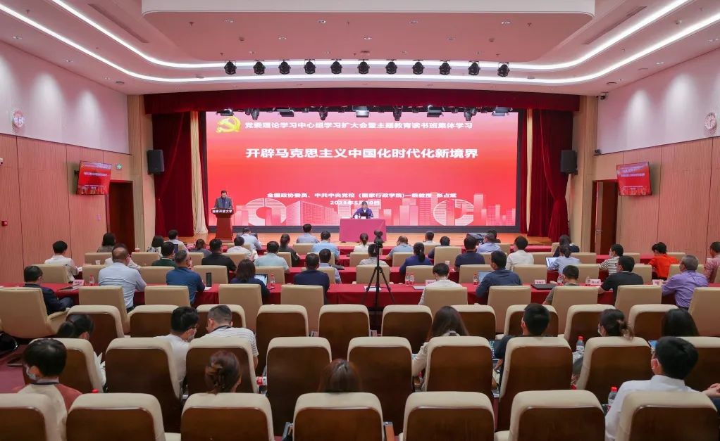 张占斌以“开辟马克思主义中国化时代化新境界”为题,围绕习近平新时代中国特色社会主义思想的形成过程、创立背景、主要内容、历史地位4个方面,作了深入浅出、透彻生动的解读阐述。张占斌强调,习近平新时代中国特色社会主义思想是新时代的伟大创造,是新征程的根本指针,全党全国各族人民要更加紧密地团结在以习近平同志为核心的党中央周围,全面贯彻习近平新时代中国特色社会主义思想,踔厉奋发、勇毅前行,为全面建设社会主义现代化国家、全面推进中华民族伟大复兴而团结奋斗。