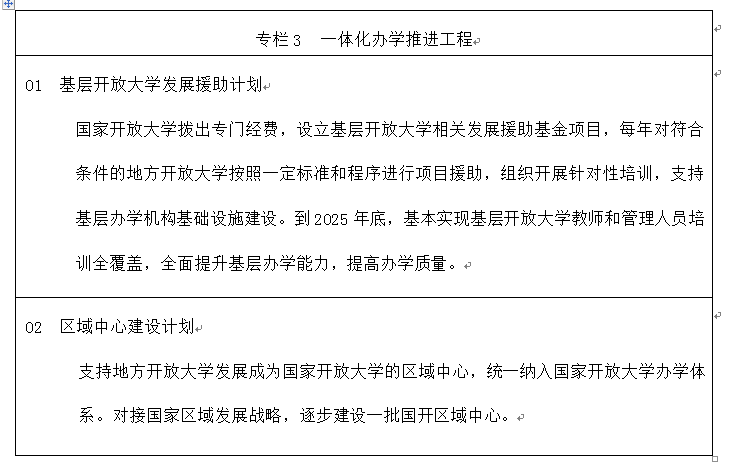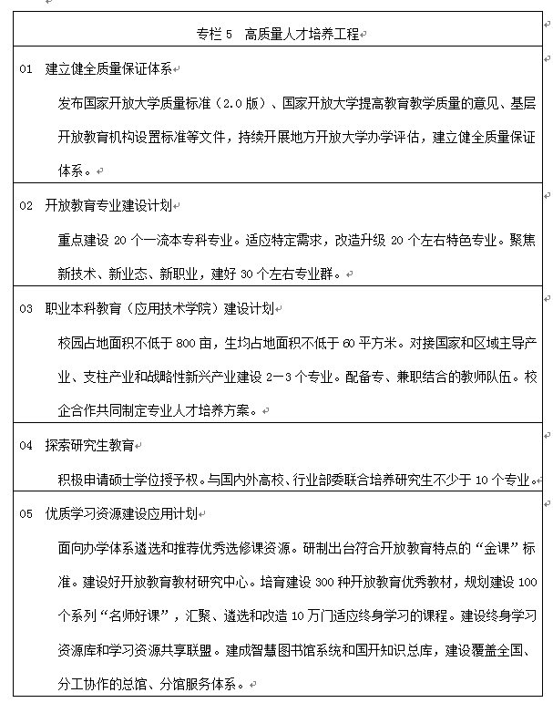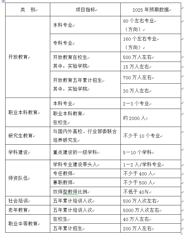 到2025年底,基本建成中国特色世界一流开放大学,成为我国终身教育的主要平台、在线教育的主要平台和灵活教育的平台、对外合作的平台,在服务全民终身学习和建设技能型社会中发挥不可替代的作用: