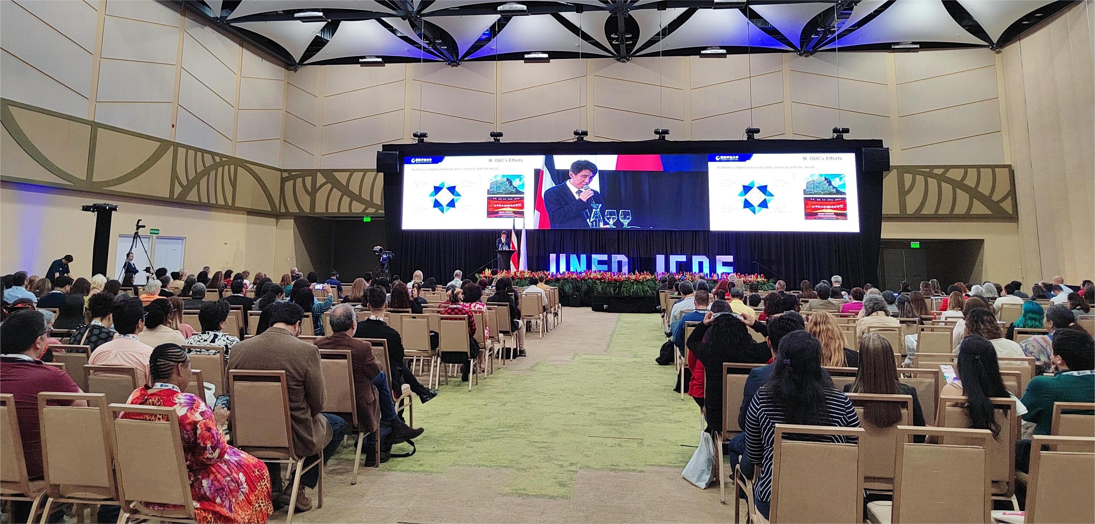 王启明以《建设面向全球的数字化大学:开放教育与高等教育的未来(Building a Global Digital University: Open Education and the Future of Higher Education)》为题作主旨发言。他从国际共识、中国行动、国开作为、未来展望四个方面分别阐述了教育数字化转型的国际趋势,中国的教育数字化战略与行动,球王会官网建设“一所链接世界的数字化大学”的举措和成绩,以及在数字化大学建设等领域开展国际合作的愿景和倡议。