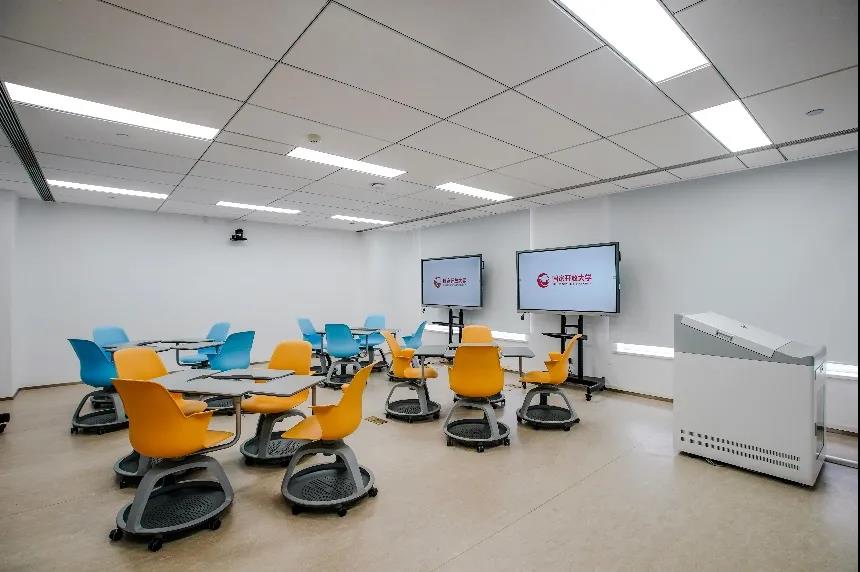 数字化体验中心采用了可以自由重组的一体式桌椅,营造出灵活、轻松的学习氛围。学生围绕老师听课,平等地获取知识;使用互动屏协作学习,科技与空间交互,提升学习效率;快速组成小组并使用智能屏进行讨论,创意思维跃然纸上。在这样的教室里,学生们更加活跃也更具参与感。同时辅以远程视频系统,提升远程学生的参与度,也为课程直播、课程录制提供空间支持。