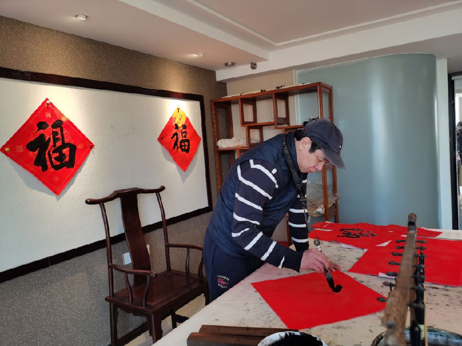 书画协会负责人王国川和朱志忠为教职工书写春联和福字