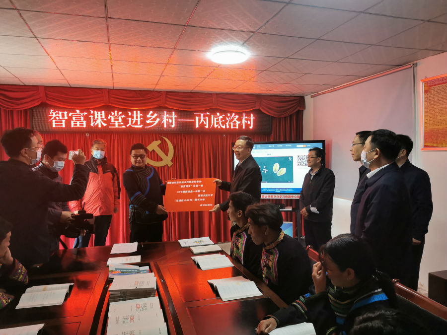 丙底洛村位于金阳县城西北部,平均海拔2400米,属于高寒山区彝族聚居村。为助力金阳县推普脱贫攻坚工作,球王会官网捐赠丙底乡丙底洛村和包谷山村幼教点“智富课堂”进乡村设备各一套、65寸触摸液晶一体机各一台,语文出版社捐赠丙底洛村《普通话1000句》50本。