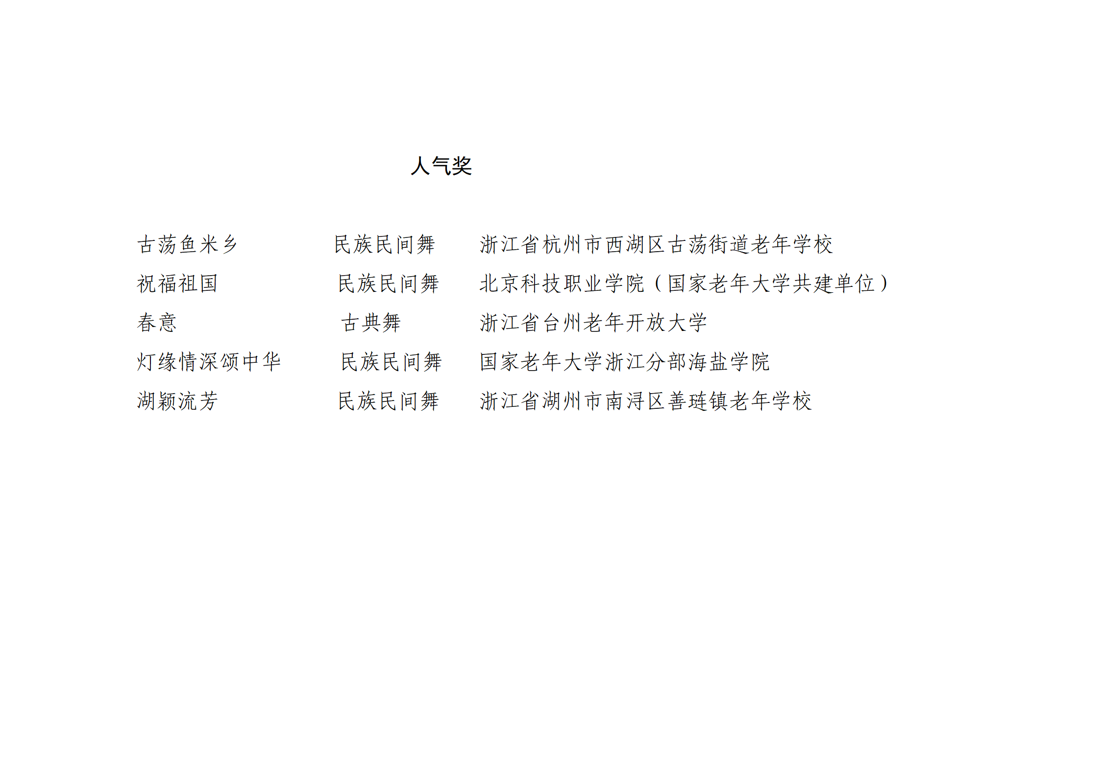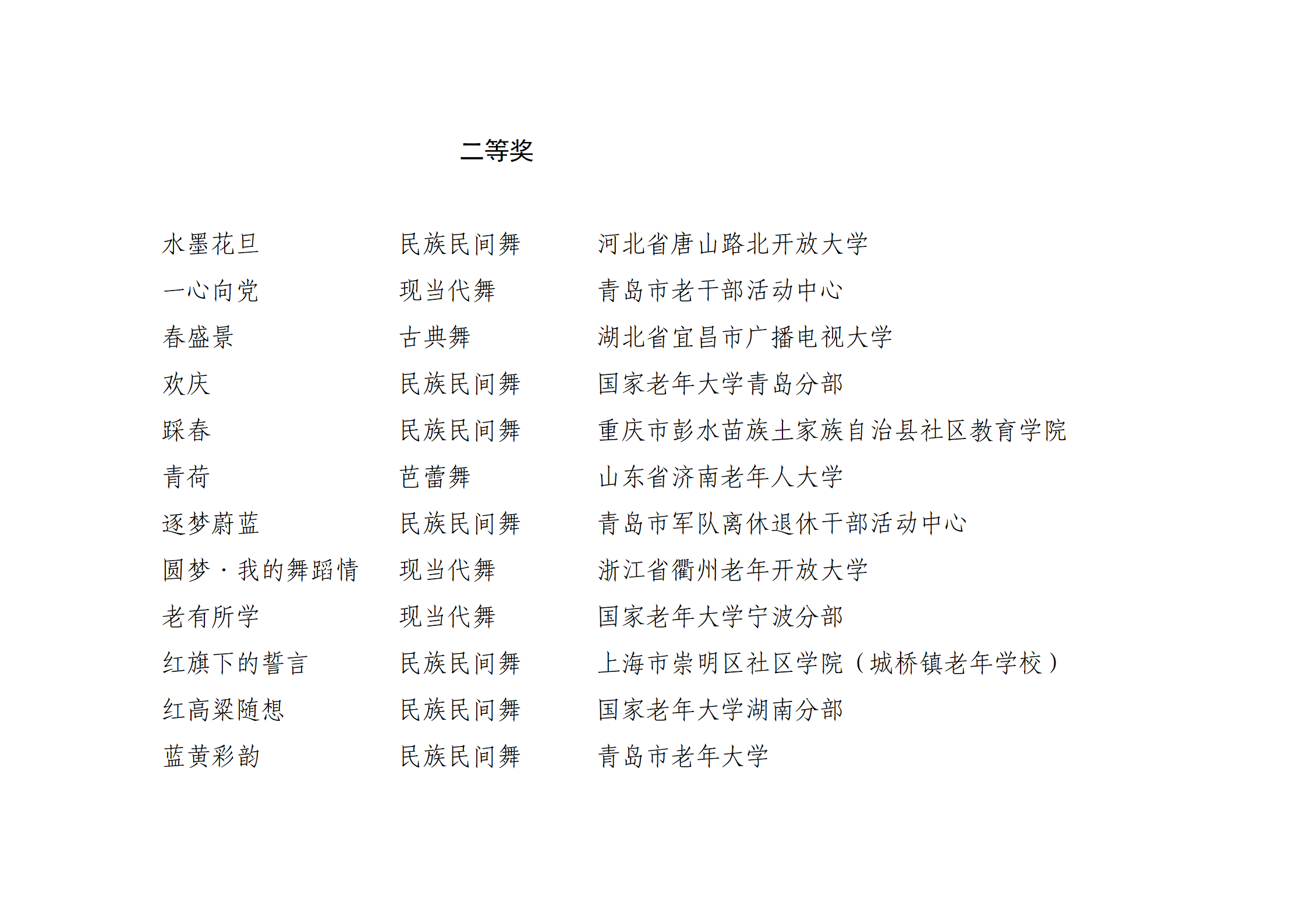2024年4月30日,国家老年大学印发了《关于举办国家老年大学全国老年教育舞蹈类教学成果展的通知》(以下简称《通知》),《通知》下发后,办学体系各单位积极部署,认真组织,共选送376个作品。经过专家评审组初评、复评和终审评议等环节,最终拟定80个作品获得奖项,其中,一等奖5个,二等奖15个,三等奖20个,优秀奖35个,人气奖5个,现将拟获奖名单予以公示,公示期为2024年8月1日—2024年8月7日。