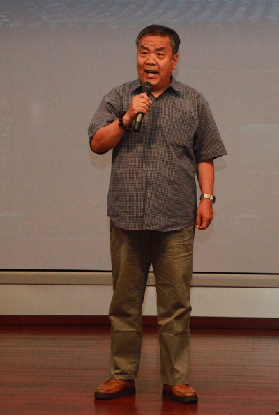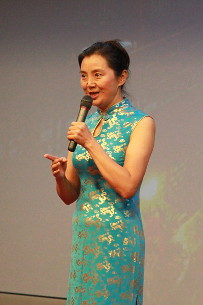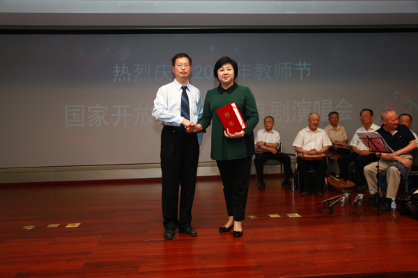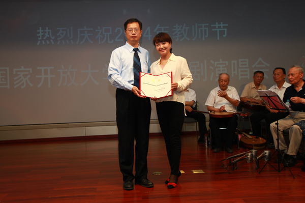 严冰主持本场京剧演唱会,为每一个经典曲目引经据典,讲述精彩唱段背后的故事,博得教职工的阵阵掌声。