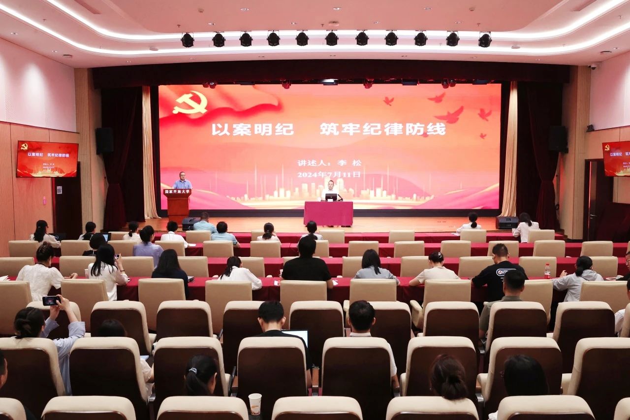 为扎实推进党纪学习教育,引导党员干部学纪、知纪、明纪、守纪,7月11日,球王会官网党委委员、副校长李松以《以案明纪,筑牢纪律防线》为题,为人文学院党支部、艺术学院党支部、理工学院党支部、终身教育研究院党支部、教务部党支部、学习资源部党支部、质量监控部党支部、学分银行党支部等八支部全体党员、入党积极分子和青年理论学习小组成员讲专题党课。