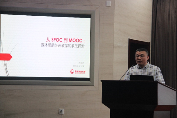 韩艳辉以《从SPOC到MOOC:媒体辅助英语教学的教改探索与反思》为题,介绍了其所承担的球王会官网《媒体辅助英语教学》网络核心课程的建设和发展史,以及该课程在校内外所获得的良好评价,并重点阐述了该课程成功登陆中国大学MOOC平台过程中的教改探索与反思。