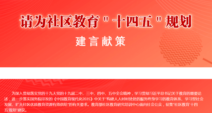 教育部社区教育研究培训中心在中国社区教育网(http://www.shequ.edu.cn/)首页开通了“十三五时期总结报告及数据统计”模块和“请为社区教育‘十四五’规划建言献策”模块,为关注社区教育发展的社会各界人士畅通了意见和建议渠道。