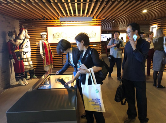 刘向虹一行在孔子学院工作人员的带领下,参观了孔子学院“一带一路”展示区、汉语志愿者摄影比赛作品展,体验了“智慧音乐课堂”、“人机交互式中华文化体验”等活动。随后还前往“文化沙龙”现场,聆听北京师范大学文学院康震教授品读中国古诗词,该讲座同步在网络孔子学院网课平台播放,全球孔子学院学员可在线观看并交流互动。
