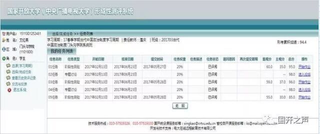 早期开放教育形成性考核任务的发布采用统一的纸质形成性考核册,学生在学习过程中分阶段完成作业,辅导教师定期收取作业册,评阅并记录成绩。形成性考核成绩作为课程总成绩的一部分,所占比例一般为20%-30%。