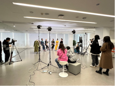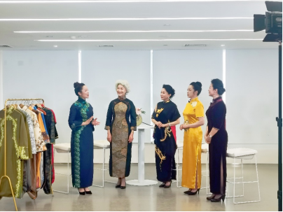 在充满科技感的智慧校园里,参与拍摄的学员们妆容精致,身着旗袍,伴着音乐,优雅地练习着走秀,还时不时传来关于穿搭的讨论声与爽朗笑声。现代与典雅、沉淀与蓬勃,这些看似矛盾的词语正是拍摄现场一角的生动写照。