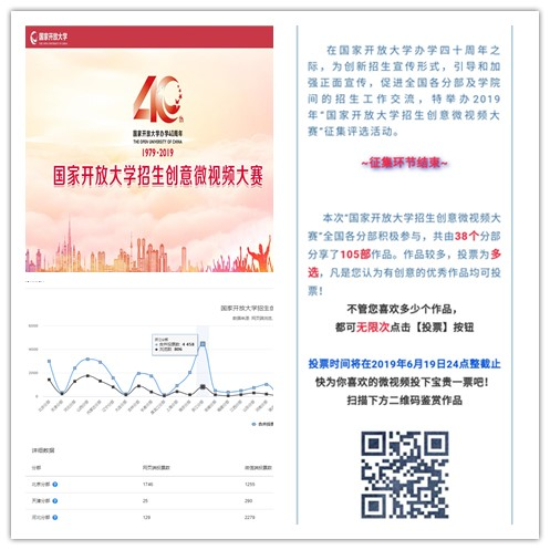 大赛开通了专门的展示投票网站,并通过学校官网40周年校庆主页、国开学习网首页进行了展示与投票,国开学习网官方微信也开通了移动端投票渠道。截至6月19日24点,实际浏览和投票近70万人次。
