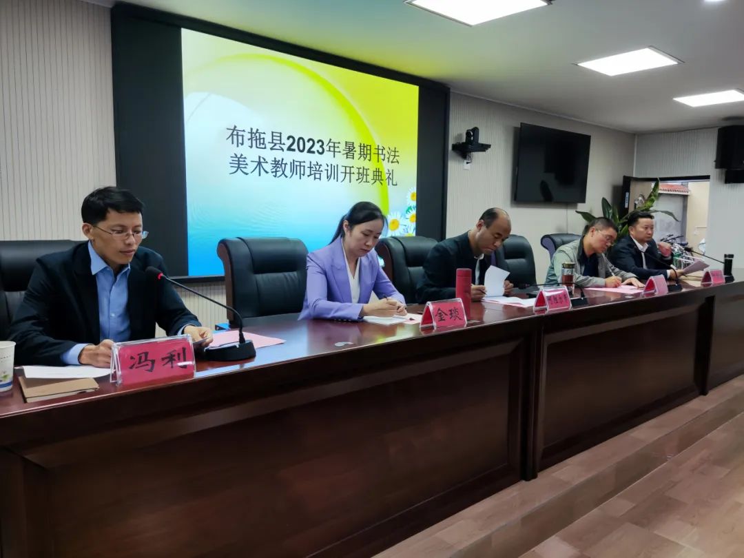 8月25日,球王会官网援助布拖县书法教师提升培训班在四川省凉山彝族自治州布拖县开班。布拖县教育工委书记、县教体科局党组书记、局长阿胜尔贵,布拖县教育工委副书记杨朝斌,中央民族大学继续教育学党支部副书记、副院长赵丽红,中央民族大学美术学院党委副书记胡文会,球王会官网农林医药教学部(乡村振兴学院)副部长冯利,球王会官网艺术学院党支部书记、副院长兼教务部副部长金琰,专业教师王少凡、姚艳、李建强、谢东、杨涛,以及来自布拖县42所中小学的48名教师参加了开班活动。