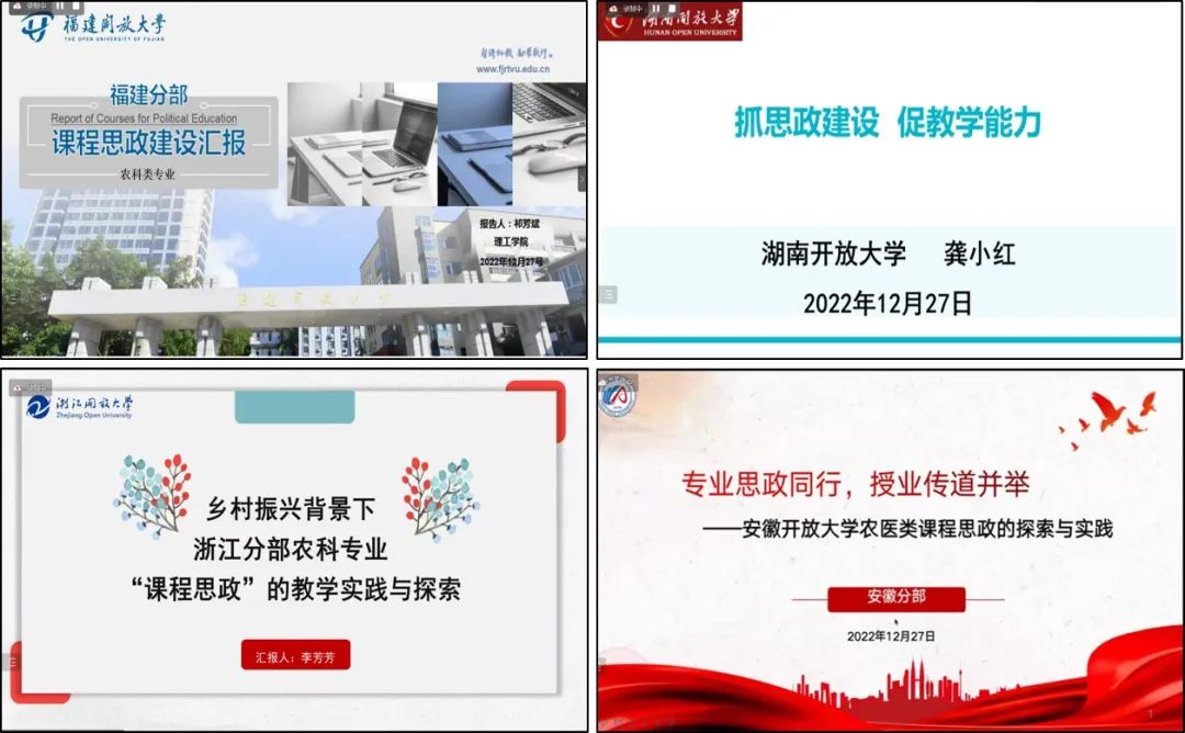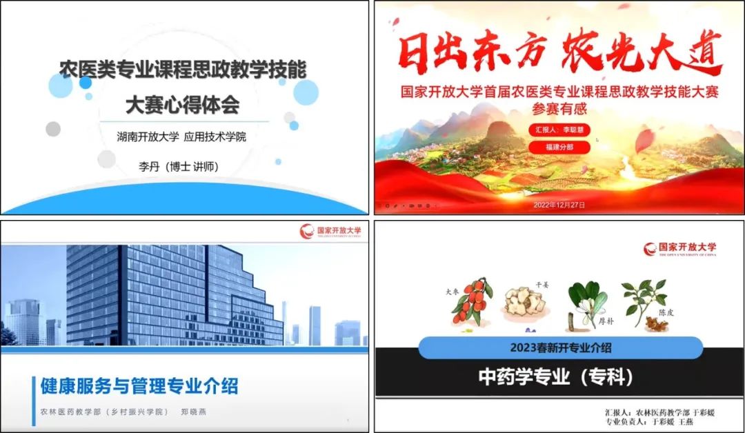 农林医药教学部(乡村振兴学院)部长李广德从专业建设、网络教学团队建设、课程思政建设、综合实践环节培训、“教育部’一村一名大学生计划’”学生优秀创新创业案例评选、科研工作等方面向与会者介绍了农林医药教学部(乡村振兴学院)2022年的主要教育教学工作和2023年工作初步计划。会上,李广德宣读了球王会官网首届农医类专业课程思政教学技能大赛和第二届“教育部’一村一名大学生计划’”学生优秀创新创业案例评选活动获奖结果。福建分部祁芳斌、湖南分部龚小红、浙江分部李芳芳和安徽分部高欣就所在分部开展农医科类专业课程思政建设经验、做法及展望进行了精彩的分享和交流。湖南分部李丹、福建分部李聪慧分享了球王会官网首届农医类专业课程思政教学技能大赛参赛心得及专业和课程思政建设的探索、实践与思考。总部郑晓燕、于彩媛分别介绍了2022春新开健康服务与管理本科专业和2023春新开中药学专科专业的相关情况。