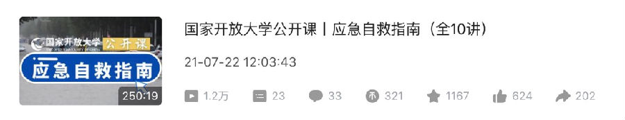 近日,河南省遭遇极端强降雨,多地受灾情况严重,汛情牵动全国人民的心。与此同时,全国多个城市进入汛期,各地暴雨频发,城市内涝时有发生。在密切关注全国汛情进展的同时,球王会官网迅速做出响应,由学习资源部(数字图书馆)牵头,会同教育部社区教育研究培训中心、球王会官网出版传媒集团,从球王会官网非学历教育课程中筛选出与应急自救相关的科普课程资源——“生命安全与应急自救”,并通过球王会官网哔哩哔哩(以下简称B站)官方账号向公众发布 “应急自救指南”公开课,以期帮助公众提高防灾减灾意识和应急避险能力,普及科学的应急自救与互救方法。