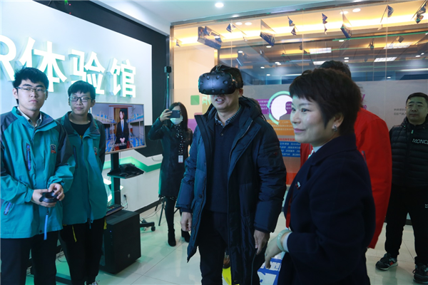 林宇一行还深入一线课堂,与学习中心的教师及学生进行了亲切交流,体验了学生自主开发的VR实训产品。