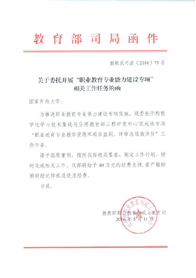 近日,球王会官网收到教育部职业教育与成人教育司发来的《关于委托开展“职业教育专业能力建设专项”相关工作任务的函》(教职成司函〔2016〕75号)。为推进职业教育专业能力建设专项实施,教育部职成司特委托国开数字化学习技术集成与应用教育部工程研究中心完成专项“职业教育专业教学资源库项目监测、评审与绩效评价”工作任务,并给予40万元经费支持。至此,球王会官网工程中心近年来获纵向课题经费累计突破100万元。
