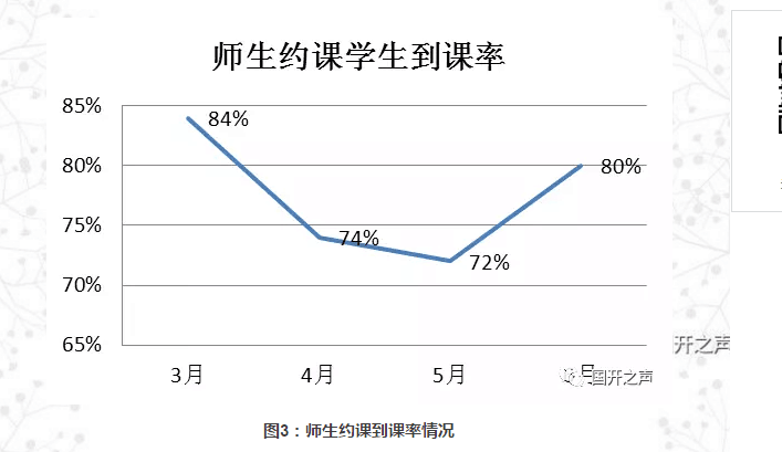 “师生约课”的方式,彻底解决了学生零到课率的问题。数据显示,4个月份学生到课率略有起伏,但平均到课率仍达到77.5%,即通过“师生约课”的方式,能更大可能地协调师生上课的时间与方式,保证更多的学生可以参与到教学过程中来,一定程度上缓解了学生因工学矛盾而无法参与学习的难题。