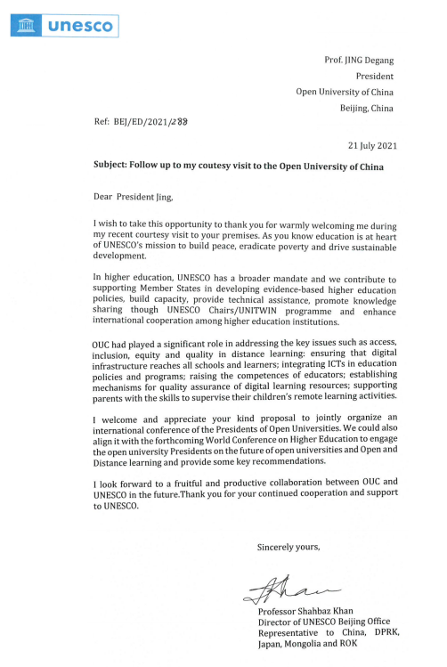 2021年7月8日,联合国教科文组织新任驻华代表夏泽翰教授一行访问球王会官网,对学校在新冠肺炎疫情前后利用现代信息技术手段实现教育公平所取得的成就表示高度赞赏。7月21日,夏泽翰教授专门致函党委书记、校长荆德刚,再次表达了他对球王会官网在开放远程教育领域所取得的成绩的高度认可与充分肯定。