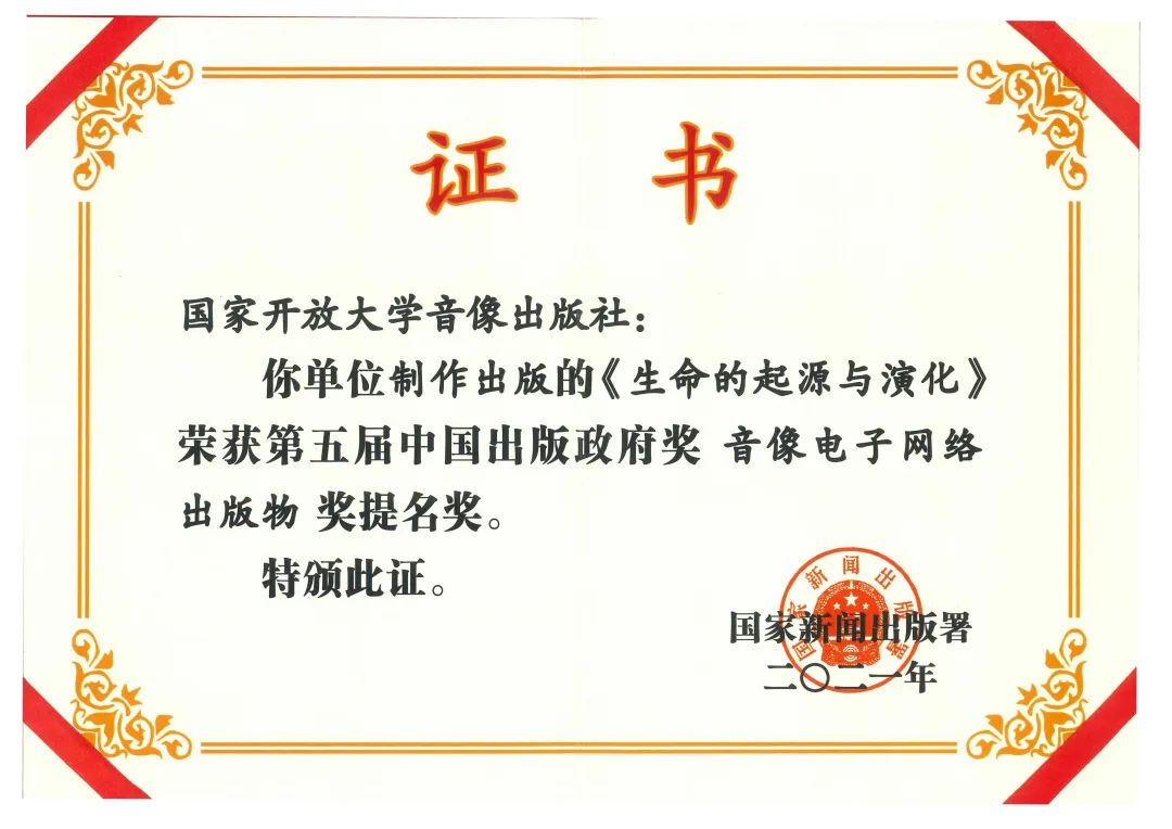 第五届中国出版政府奖音像电子网络出版物奖提名奖《生命的起源与演化》